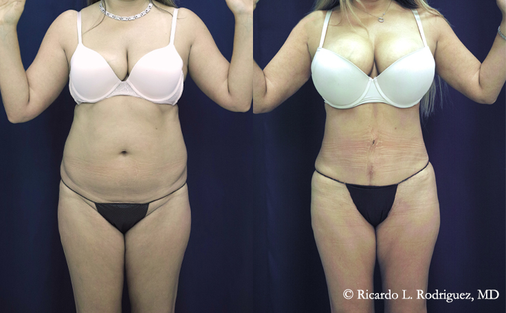 This patient in her 40s opted for a Tummy tuck along with a Brazilian Butt lift to give her figure the look she was after. With IV Sedation, this combination can be safely performed together and the transformation achieved is dramatic since the tummy tuck enhances the effect of the BBL. This patient underwent two operative sessions approximately two years apart for a combined total of approximately 7200 cc of fat was removed from her abdomen, flanks, scapular area, inner thighs, and upper arms with approximately 1050 cc of processed fat reinjected for her bbl.
