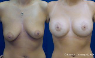 This tall (6 ft 4 in) 33-year-old patient chose to augment her breasts with 400cc, high-profile, silicone breast implants.